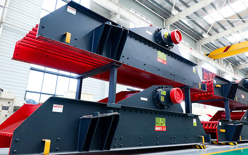 振動給料機(jī)主要由前支座、槽體、激振器、后支座、防護(hù)罩、電機(jī)、電機(jī)減震器等部件組成。振動給料機(jī)采用電機(jī)來驅(qū)動位于激振裝置內(nèi)的偏心軸。該軸通過齒輪同與之互相并列的另一根軸相連接。當(dāng)這兩根軸轉(zhuǎn)動時(shí),就產(chǎn)生了激振力。軸的這種設(shè)置方式,使得所產(chǎn)生的沖程將物料從給料端緩慢地推至排料端。與此同時(shí),對物料進(jìn)行篩分,使其粒度更加均勻。通過改變激振裝置的速度,可以對振動給料機(jī)的給料能力進(jìn)行調(diào)節(jié)。如有必要,也可以通過改變沖程的角度(采用改變齒輪相位的方法)來調(diào)節(jié)其生產(chǎn)能力。